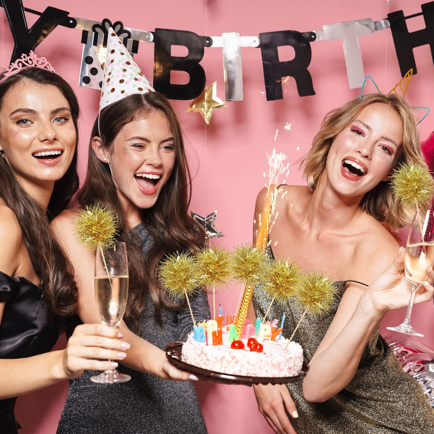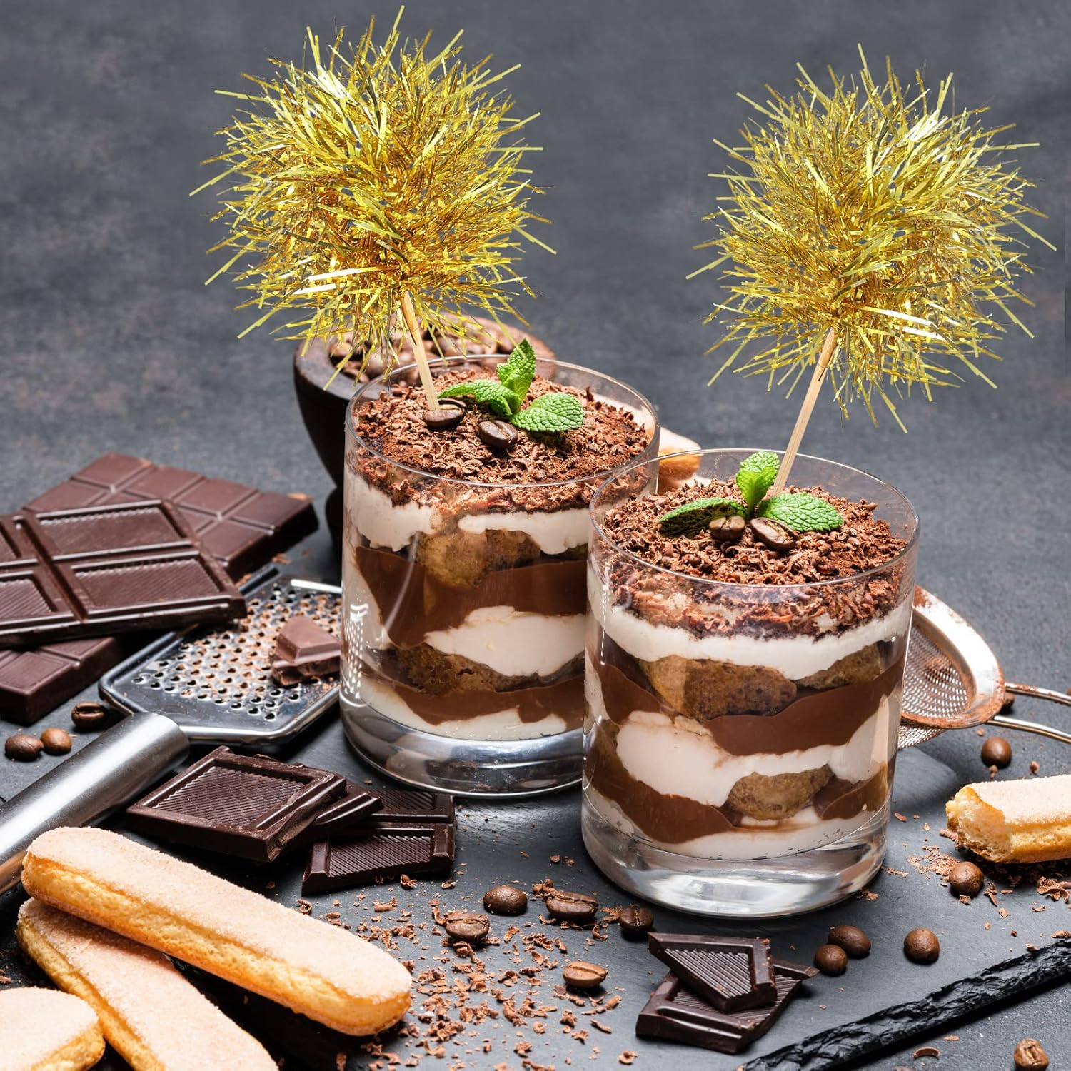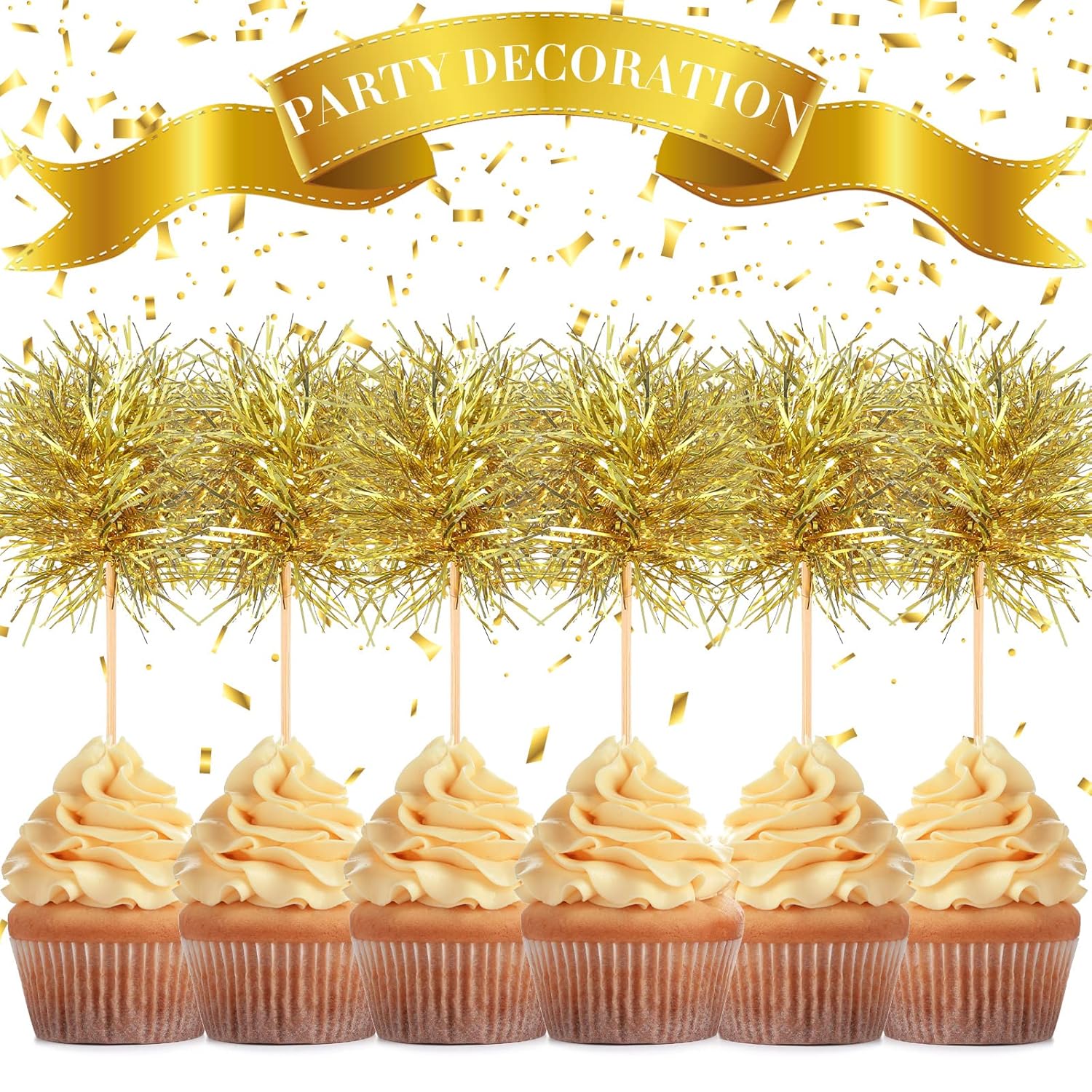 Chinco 100 Pcs Foil Firework Cupcake Toppers Sparkle Tinsel Cake Toppers Cake Decoration Cocktail Fruit Toothpick for Birthday Wedding Graduation Party(Gold)
