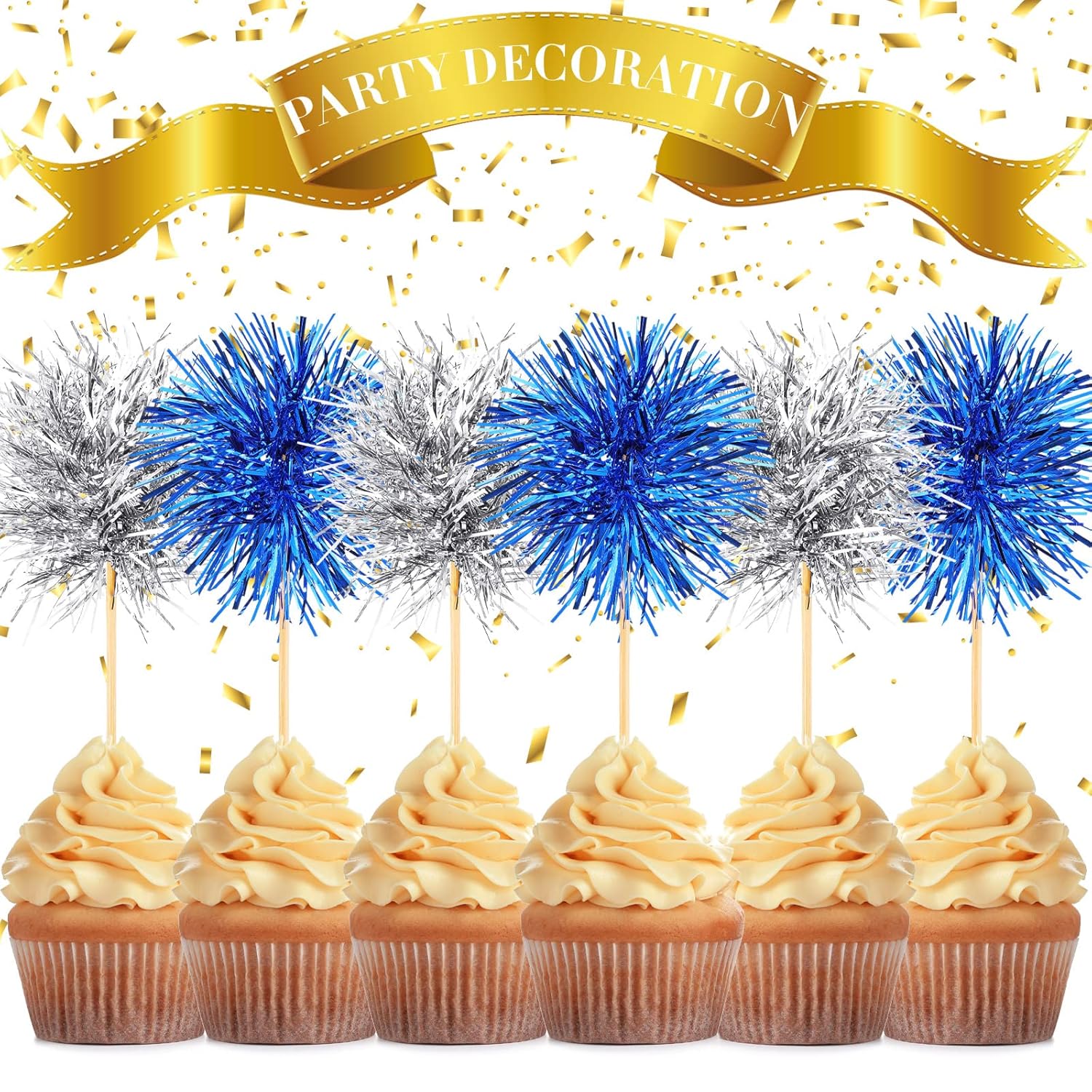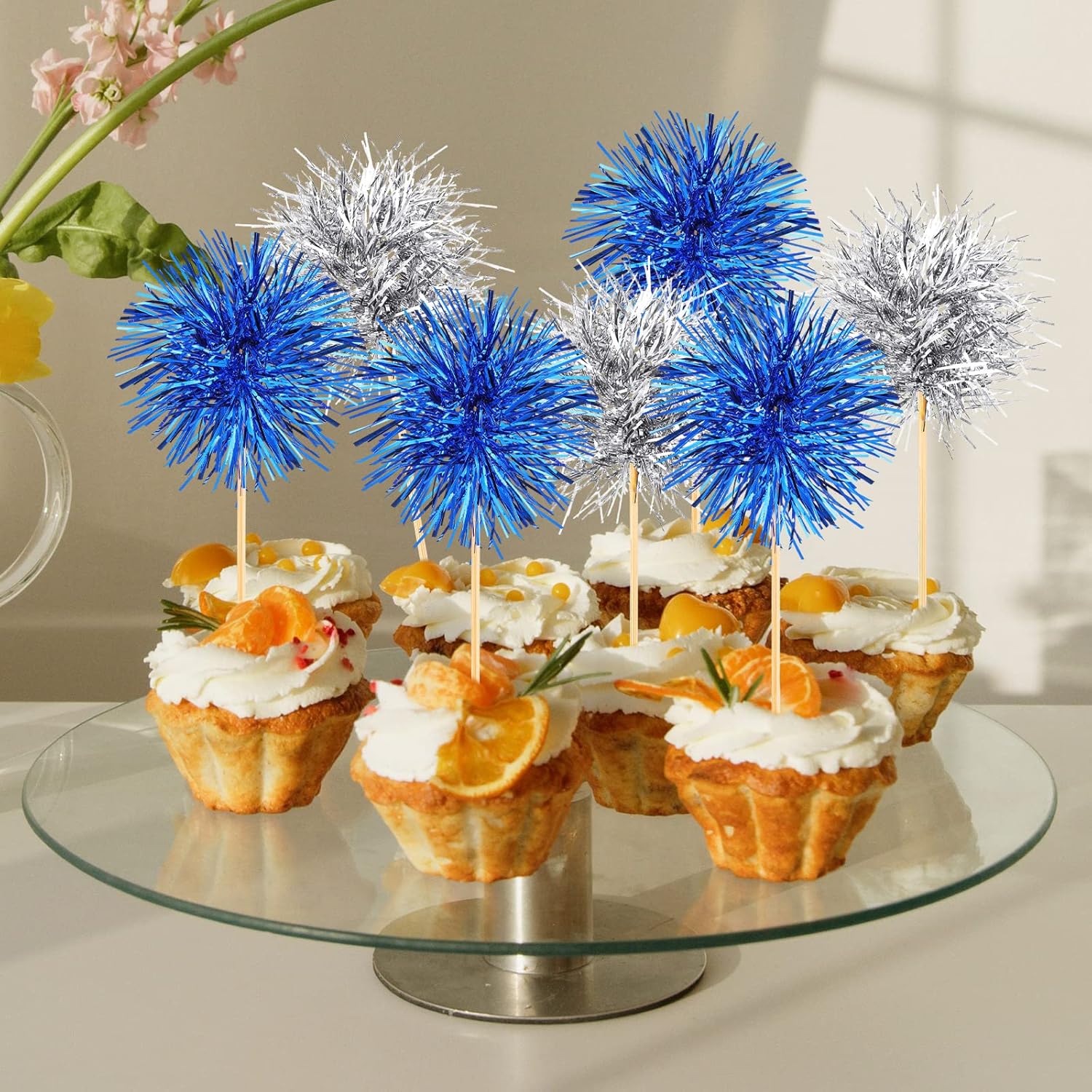 Chinco 100 Pcs Foil Firework Cupcake Toppers Sparkle Tinsel Cake Toppers Cake Decoration Cocktail Fruit Toothpick for Birthday Wedding Graduation Party(Silver, Blue)