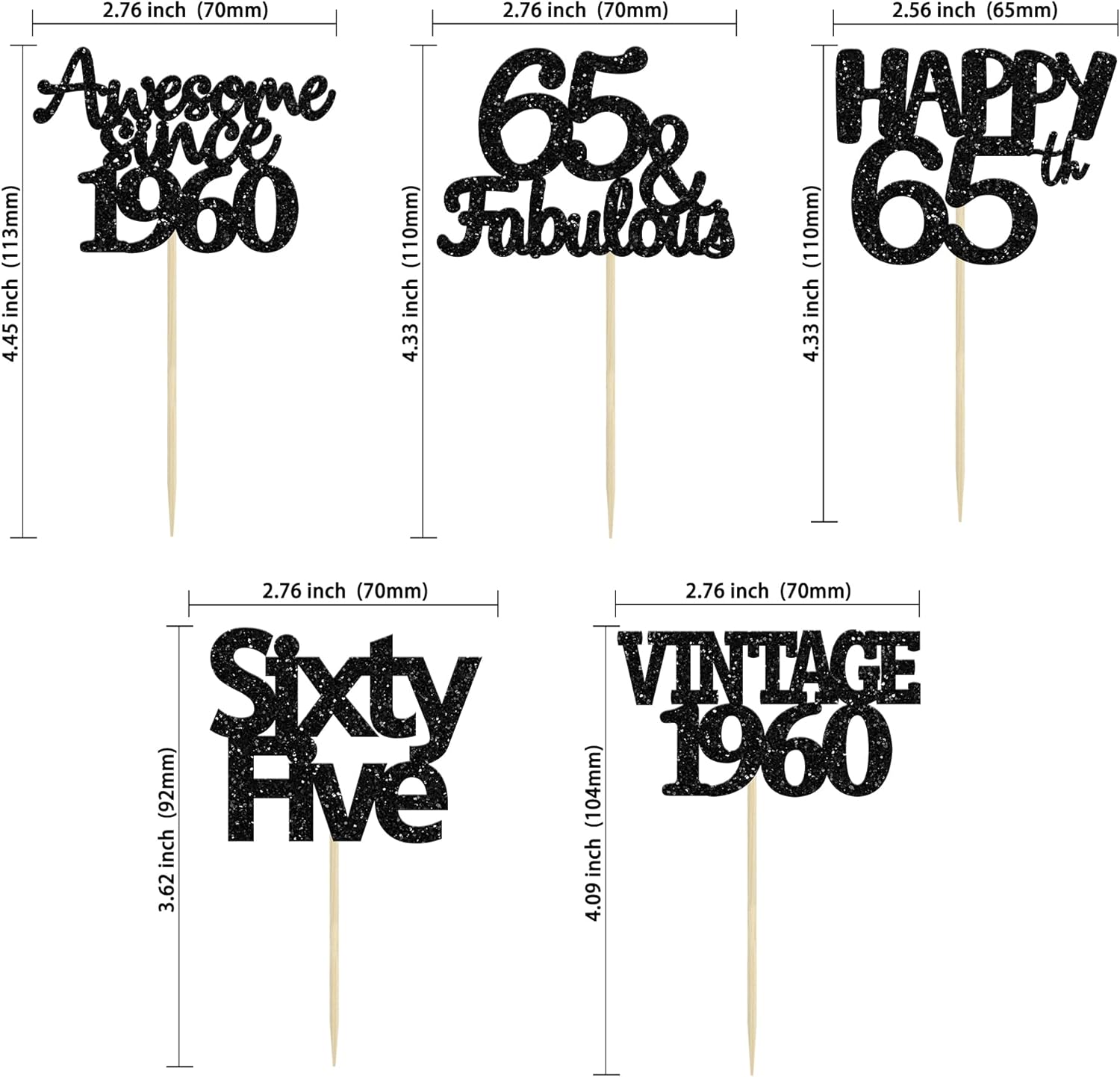 - ♡Premium Material: These glitter Black 65 Cupcake Toppers are made of high quality 300 gram glitter card stock and food-grade toothpick, very safe to put them on cakes, cupcakes, ice cream, fruits, pie, dessert, cheese or any dish and food appetizer you want to decorate.