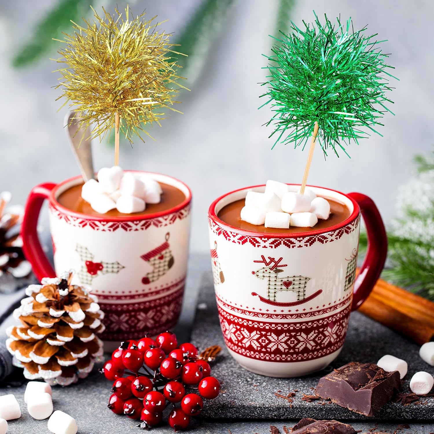 Chinco 100 Pcs Foil Firework Cupcake Toppers Sparkle Tinsel Cake Toppers Cake Decoration Cocktail Fruit Toothpick for Birthday Wedding Graduation Party(Green, Gold)