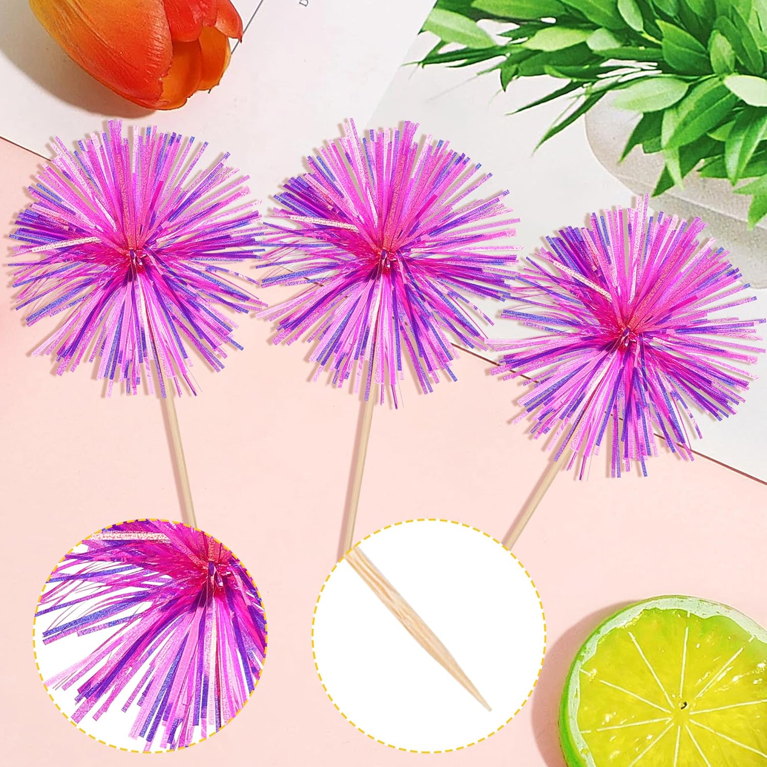 30 PCS Foil Firework Cupcake Toppers Happy Birthday Cupcake Toppers Sparkle Tinsel Flower Drink Stirrers Cocktail Fruit Toothpicks for Valentine's Day Baby Shower Party Cake Decor Supplies Rose Red