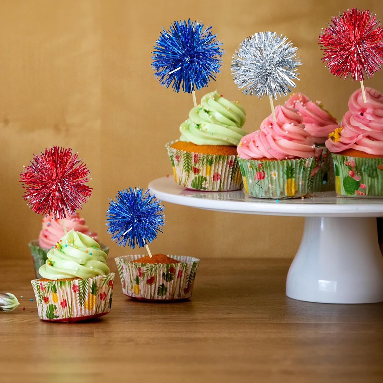 - -Premium Material: These Foil Firework Cupcake Toppers are made of high quality foil and food-grade toothpick, very safe to put them on cakes, cupcakes, ice cream, fruits, pie, dessert, cheese or any dish and food appetizer you want to decorate.