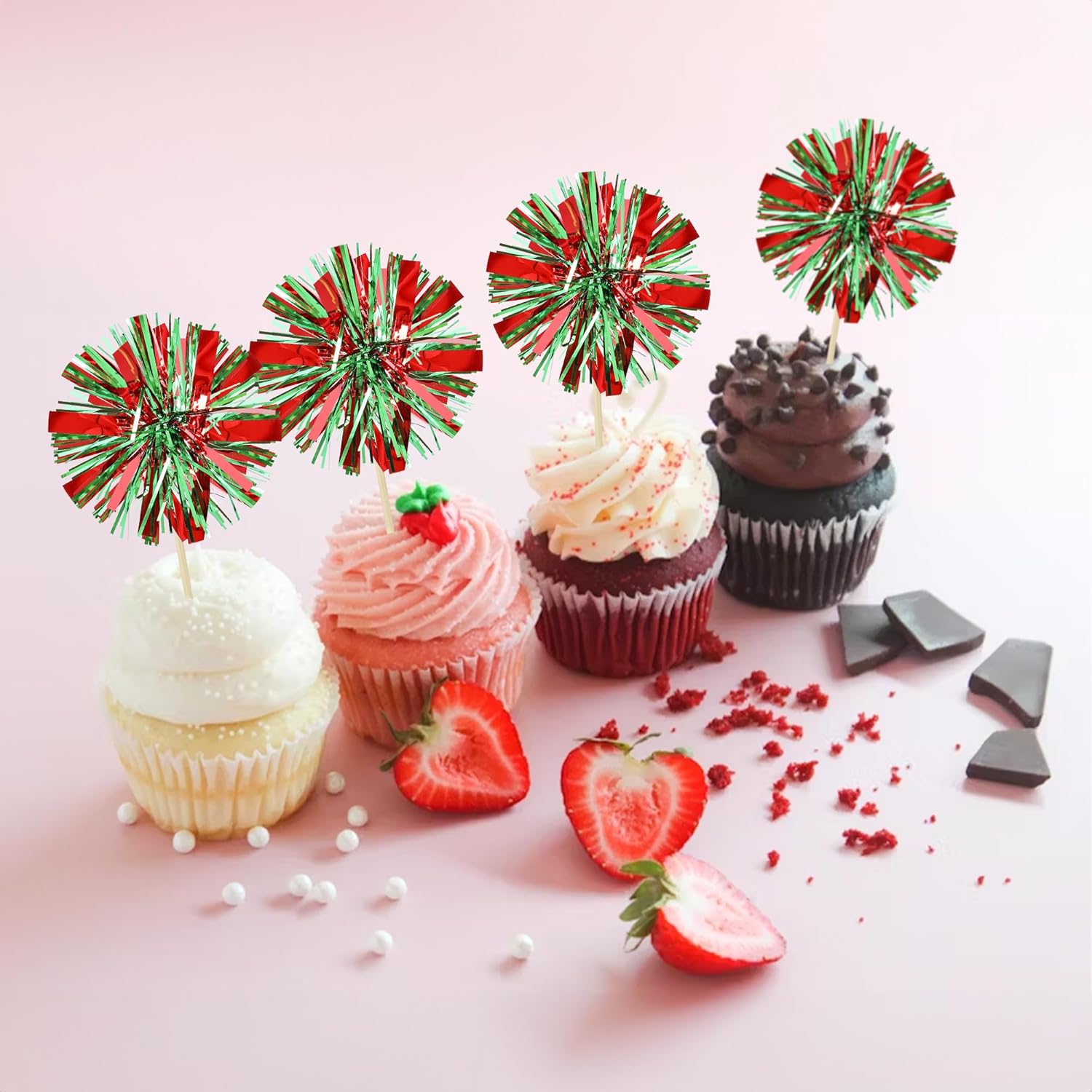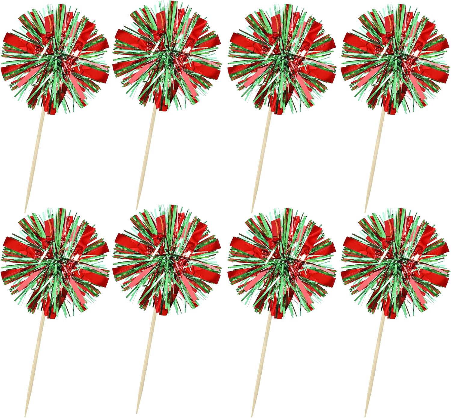 Ephlyn 30Pcs Foil Firework Cupcake Toppers Sparkle Tinsel Drink Birthday Cake Decorations Cocktail Food Fruit Toothpick for New Years Wedding Birthday Party Decorations Red Green