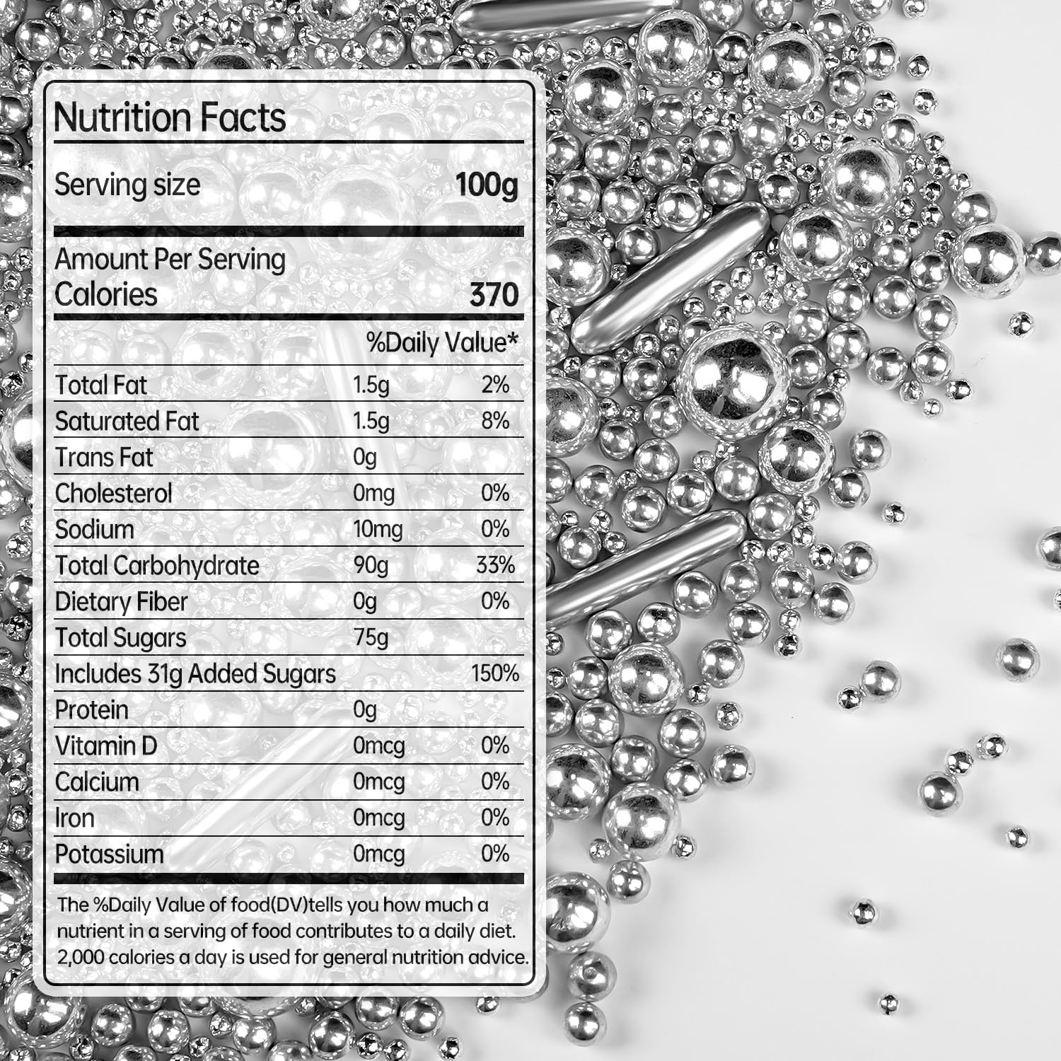 - Silver Pearl Rods Sprinkles are made from premium food-safe ingredients. These sprinkles not only look great but are also Food Grade. Net Weight: 150g/5.29oz. You can use them with confidence, because they are made from food-safe materials and are gluten-free, nut-free, preservative-free, dairy-free, chemical-free and non-GMO.