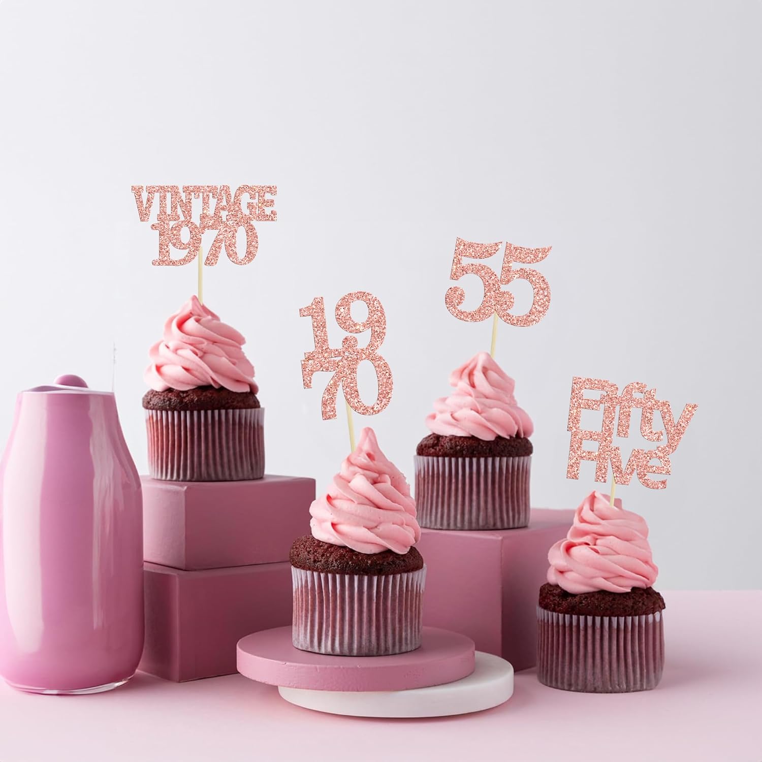 Gyufise 24Pcs 55th Birthday Cupcake Toppers Glitter Cheers to 55 Fabulous Fifty Five Vintage 1970 Cupcake Picks 55th Birthday Wedding Anniversary Party Cake Decorations Supplies Rose Gold
