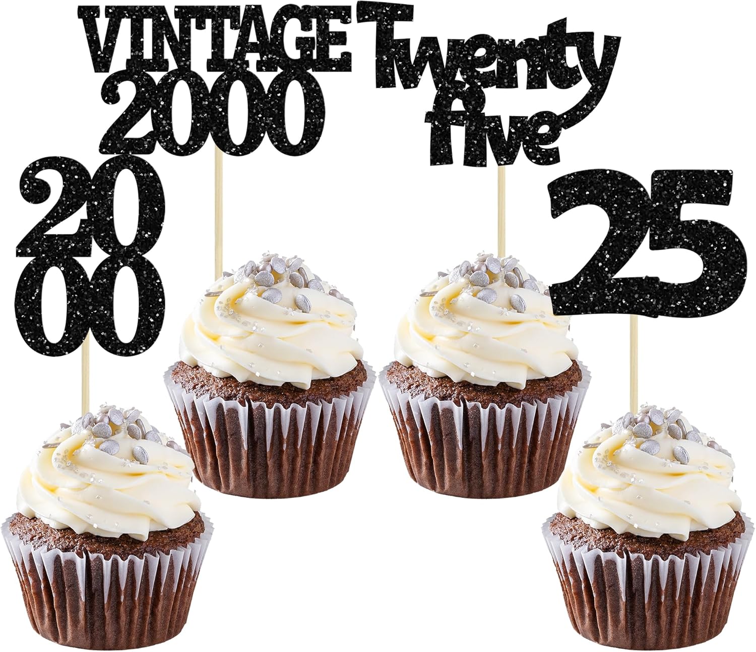 Gyufise 24Pcs 25th Birthday Cupcake Toppers Glitter Twenty-five Vintage 2000 Cheers to 25 Cupcake Picks Hello 25 Years Birthday Cake Decoration for Happy 25th Birthday Anniversary Party Supplies Black