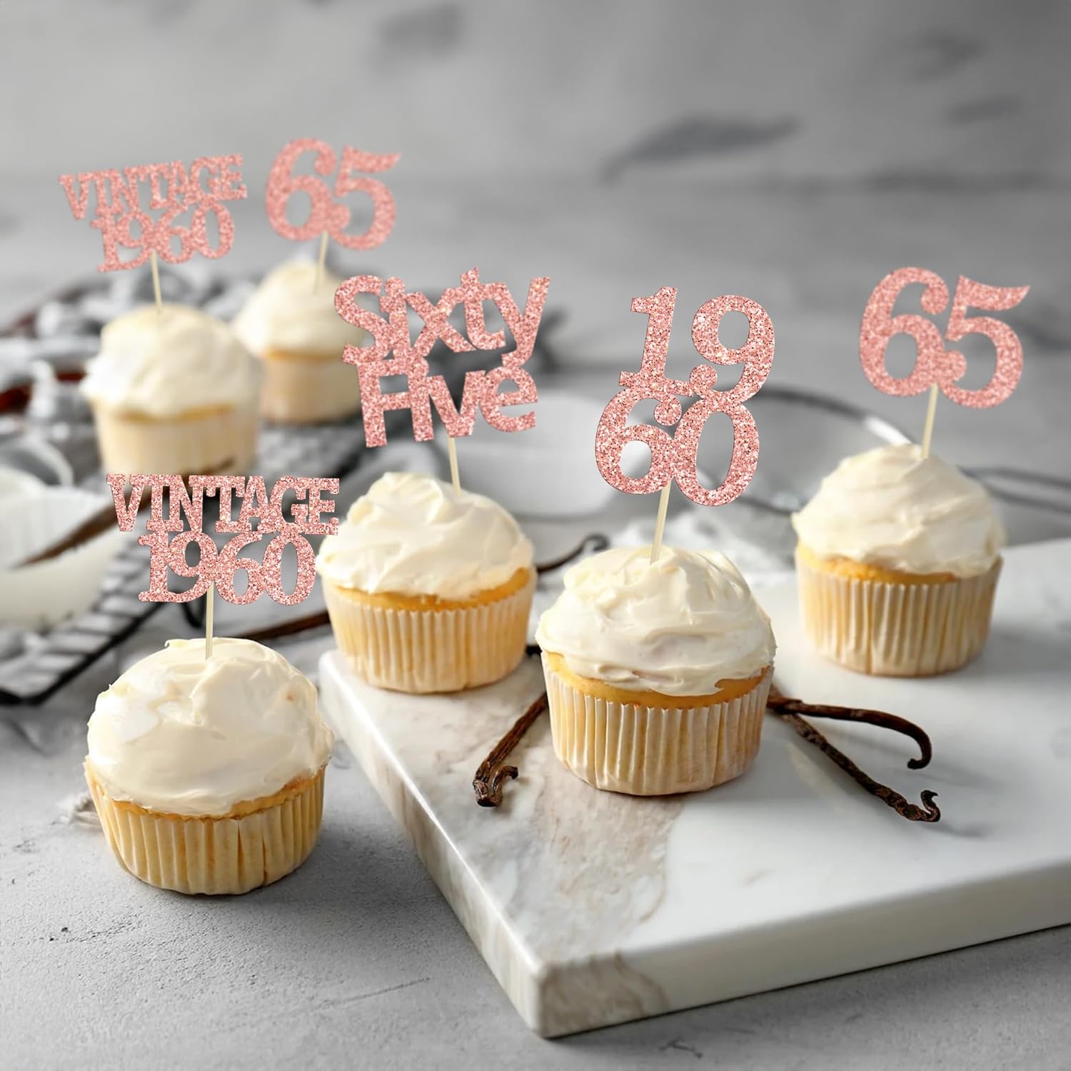 Gyufise 24Pcs 65th Birthday Cupcake Toppers Glitter Cheers to 65 Fabulous Sixty Five Vintage 1960 Cupcake Picks 65th Birthday Wedding Anniversary Party Cake Decorations Supplies Rose Gold