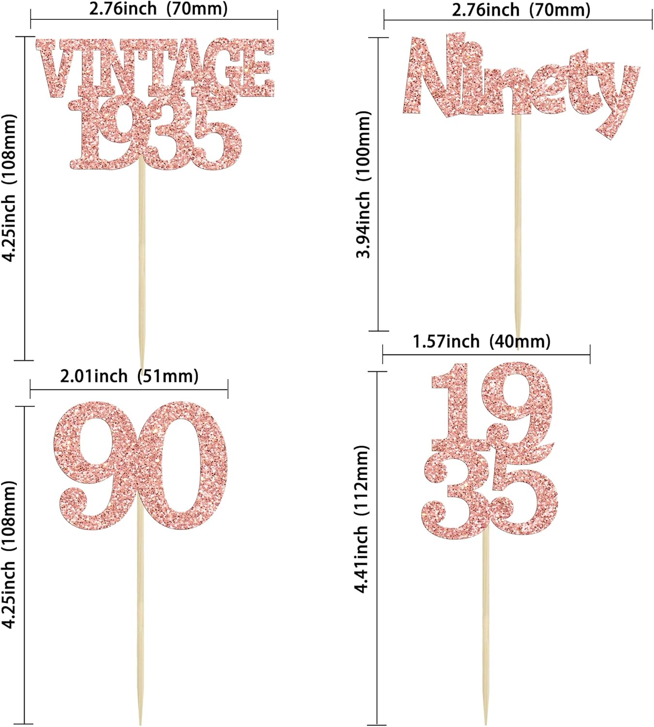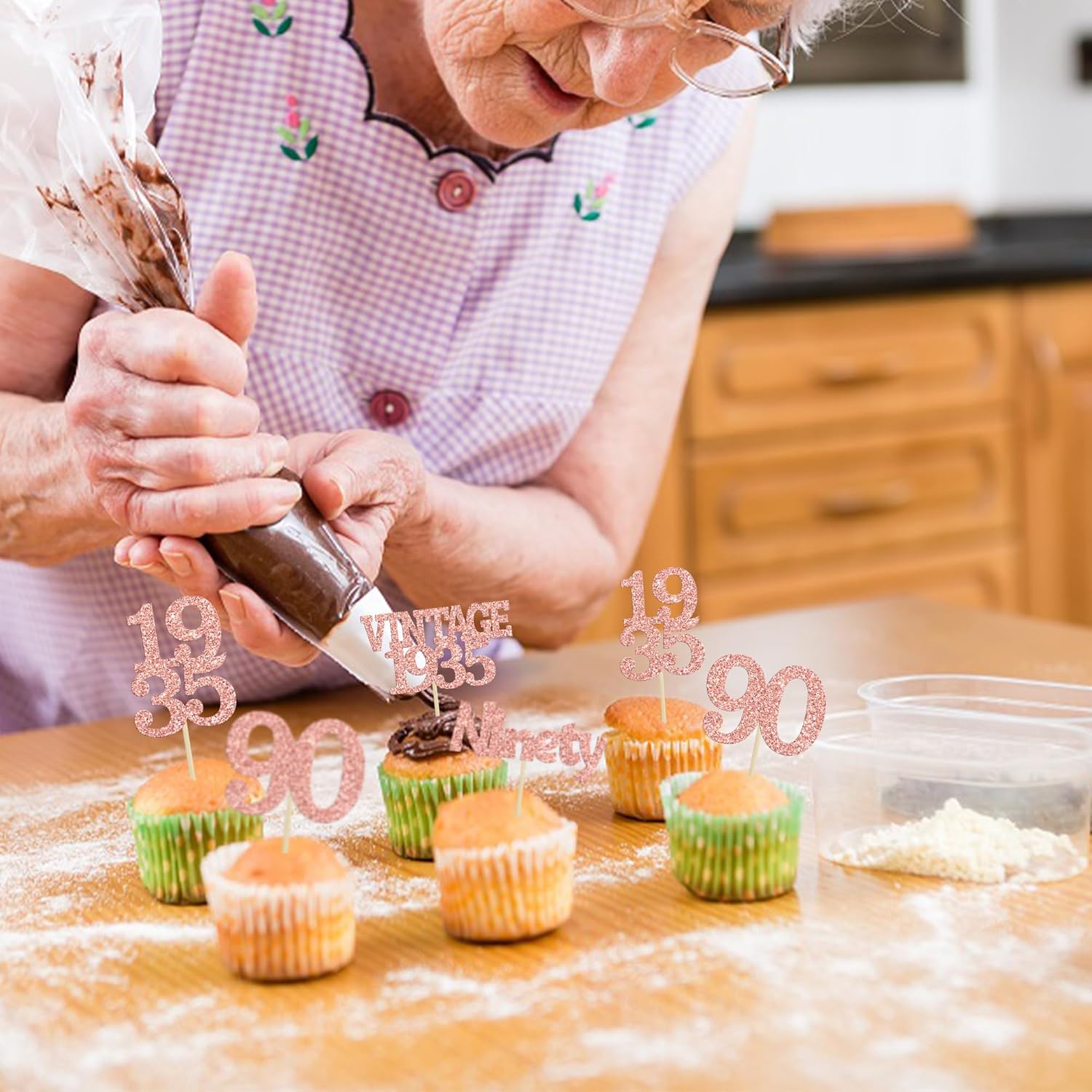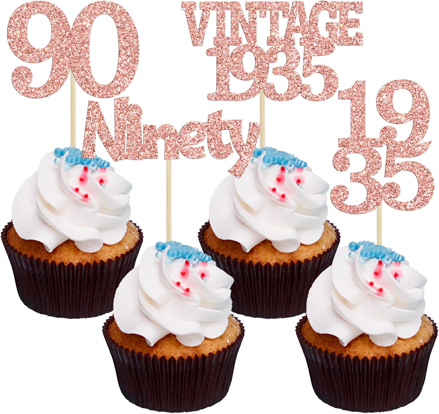 Gyufise 24Pcs 90th Birthday Cupcake Toppers Glitter Cheers to 90 Fabulous Ninety Vintage 1935 Cupcake Picks 90th Birthday Wedding Anniversary Party Cake Decorations Supplies Rose Gold