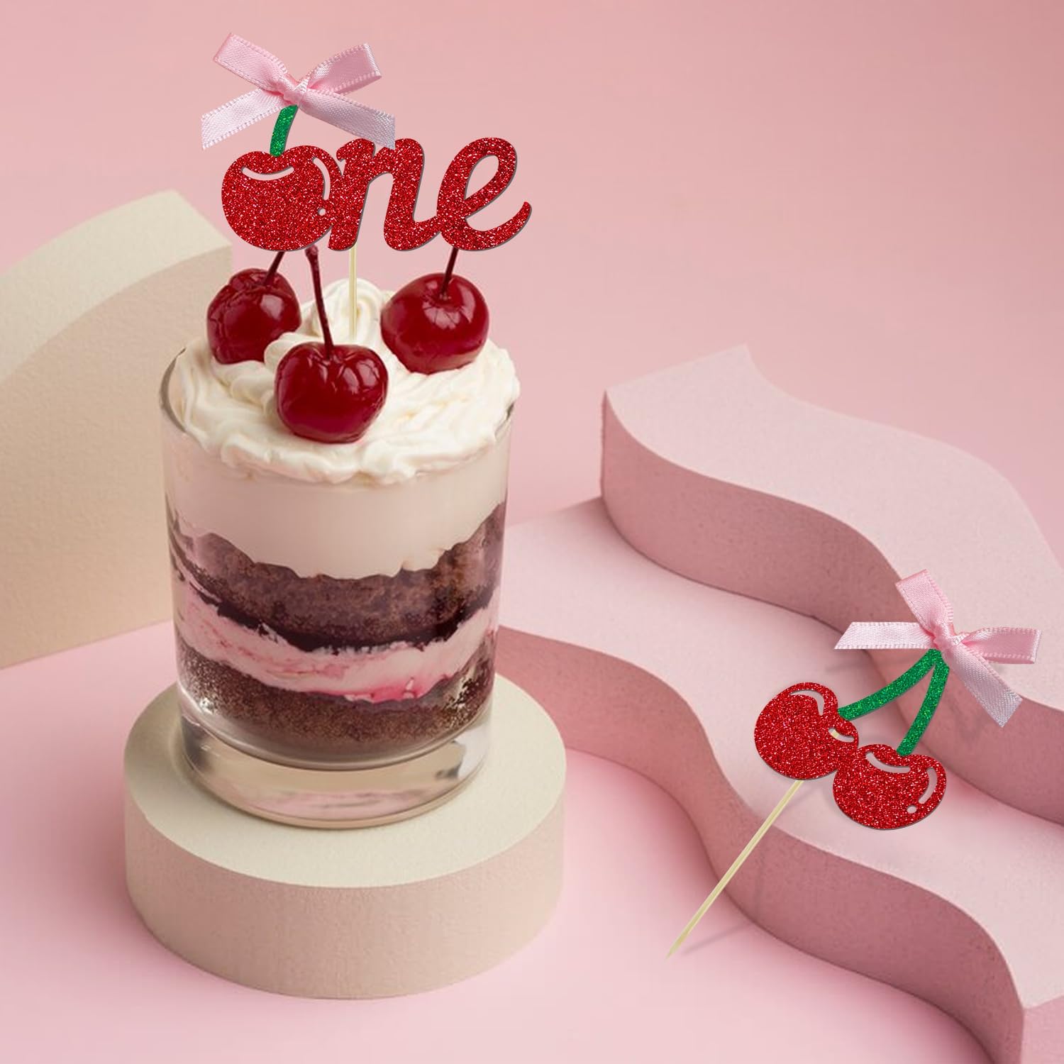 24 Pack Cherry 1st Birthday Cupcake Toppers, Glitter Cherry First Birthday Cake Pick for Fruits Theme One Birthday Party Cake Decorations Supplies (Ribbon One)