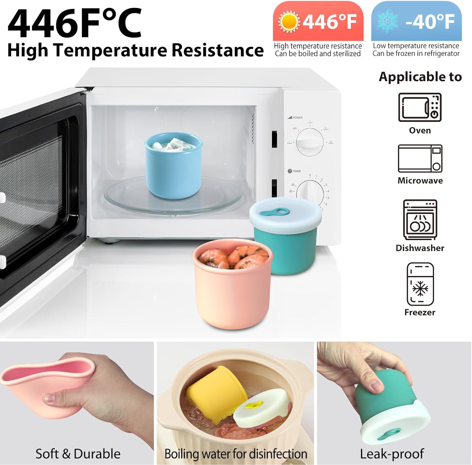- Portable Size: Each kids lunch box containers size is 3x2.6x2.2 inch. The perfect size snack containers can easily fit into any corner of a satchel backpack, or lunch bag. The silicone food storage containers available volume is 8 oz; 250 ml